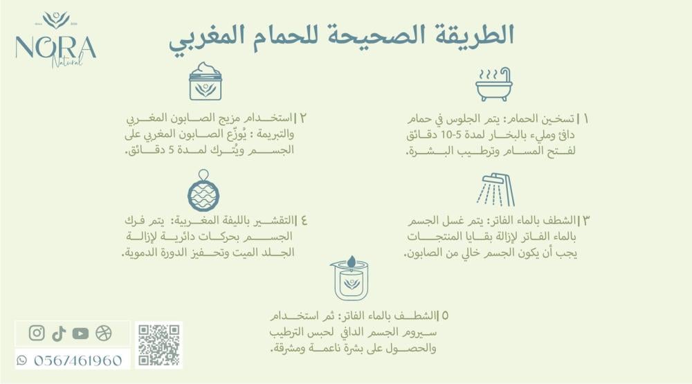 • لنتائج رائعة، يُفضل إجراء الحمام المغربي أسبوعيًا.